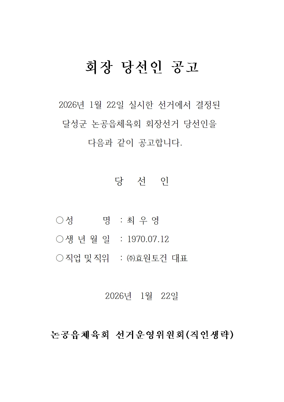 달성군논공읍체육회 회장 당선인 공고