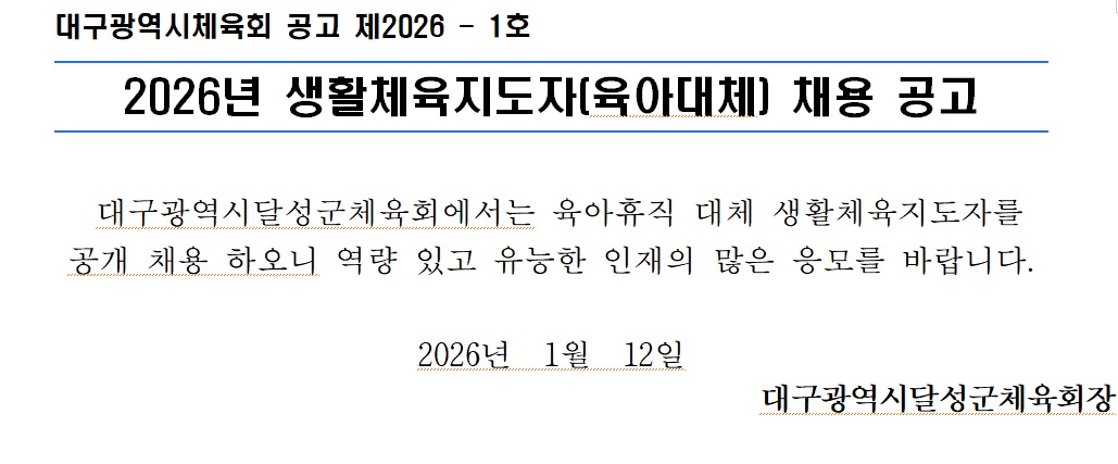 2026 육아휴직 대체 생활체육지도자 채용 공고 최고관리자 0 439 01.12 13:50 2026.01.12 13:50 대구광역시달성군체육회 공고 제 2026.hwp (94.5K) + 64 * 자세한 사항은 첨부파일 참조